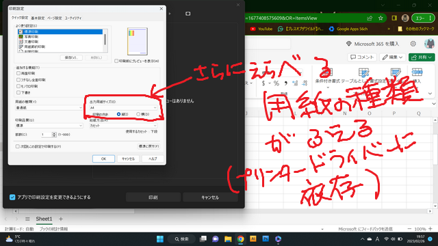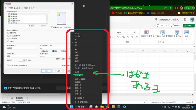 6)更にメニューが出てくるので下までスクロールすると印刷可能な「用紙サイズ」を選べる。